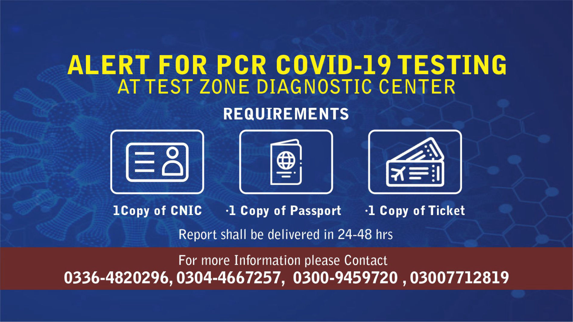 1 Copy of CNIC, 1 Copy of Passport & 1 Copy of Ticket required for COVID-19 Test.
